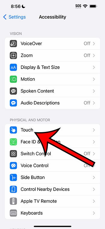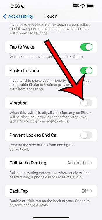 Μπορείτε να απενεργοποιήσετε όλες τις δονήσεις στο iPhone σας 14 πηγαίνοντας στοΡυθμίσεις> Προσβασιμότητα> Αγγίξτε>τότε απενεργοποιώντας τοΔόνησηεπιλογή.