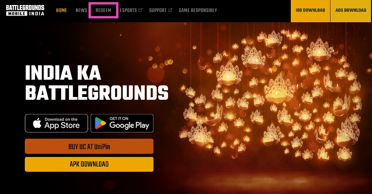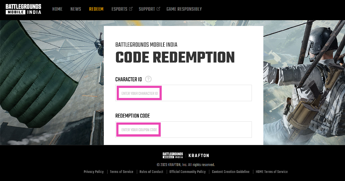 Μεταβείτε στον ιστότοπο BGMI, κάντε κλικ στο "Redeem", Εισαγάγετε το αναγνωριστικό χαρακτήρα σας, ακολουθούμενος από τον κώδικα εξαργύρωσης. Εισαγάγετε τον κωδικό επαλήθευσης που εμφανίζεται στην οθόνη και πατήστε Enter.