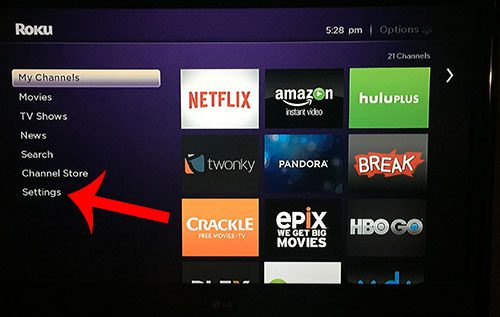 Βήμα 1: Πατήστε τοΣπίτικουμπί για να επιστρέψετε στην αρχική οθόνη του Roku 1 και στη συνέχεια μετακινηθείτε προς τα κάτω στοΡυθμίσειςεπιλογή και πατήστε τοΕΝΤΑΞΕΙκουμπί στο τηλεχειριστήριο σας για να το επιλέξετε.