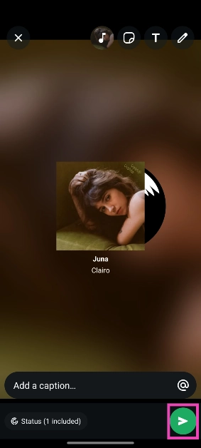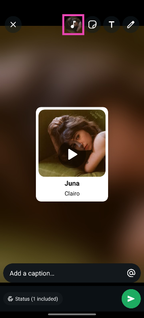 Επιλέξτε μια εικόνα ή βίντεο για να δημοσιεύσετε ως την κατάστασή σας και πατήστε το εικονίδιο μουσικής σημείωσης ή επιλέξτε το αυτοκόλλητο μουσικής. Αναζητήστε ένα τραγούδι και πατήστε το εικονίδιο βέλους για να το προσθέσετε στην κατάστασή σας.