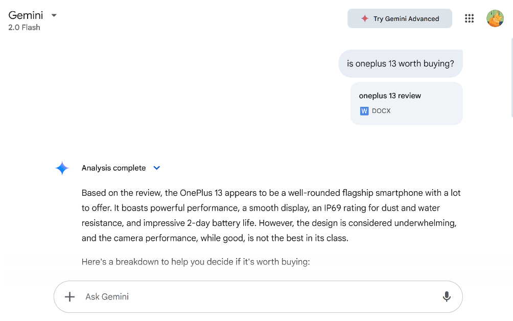 Το Google Gemini σας επιτρέπει τώρα να ανεβάσετε έγγραφα, αρχεία κώδικα, παρουσιάσεις, υπολογιστικά φύλλα και αρχεία δεδομένων πίνακα. Μπορείτε να χρησιμοποιήσετε το AI chatbot για να αναλύσετε ένα αρχείο και να χρησιμοποιήσετε μια προσέγγιση συνομιλίας για να αποκτήσετε περισσότερη εικόνα για τα δεδομένα που κατέχει. Για παράδειγμα, μπορείτε να ανεβάσετε ένα υπολογιστικό φύλλο των μηνιαίων σας δαπανών και να ζητήσετε από τον Gemini να δημιουργήσει ένα γράφημα με βάση τις δαπάνες σας. Ομοίως, μπορείτε να ανεβάσετε ένα ηλεκτρονικό βιβλίο και να το κάνετε κάθε ερώτηση σχετικά με την πλοκή ή την ιστορία. Ακολουθεί ένα γρήγορο σεμινάριο για το πώς να ανεβάσετε αρχεία στο Gemini και να τα αναλύσετε.