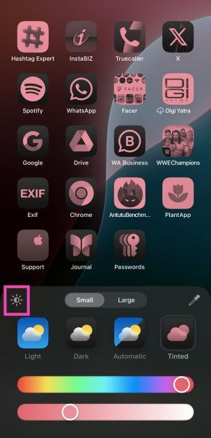 Βήμα 5:ΕπιλέγωΣκοτάδιήΧρωματισμένοςΓια εικονίδια εφαρμογής σκοτεινού τρόπου λειτουργίας. Ο πρώτος εφαρμόζει σκοτεινή λειτουργία στα εικονίδια εφαρμογών διατηρώντας τα αρχικά τους χρώματα. Η επιλογή της χρωματισμένης επιλογής κάνει τα εικονίδιαμονόχρωμοςενώ τους αναθέτετε επίσης μια πιο σκούρα σκιά. Μπορείτε να χρησιμοποιήσετε το Slider Color για να επιλέξετε την απόχρωση.