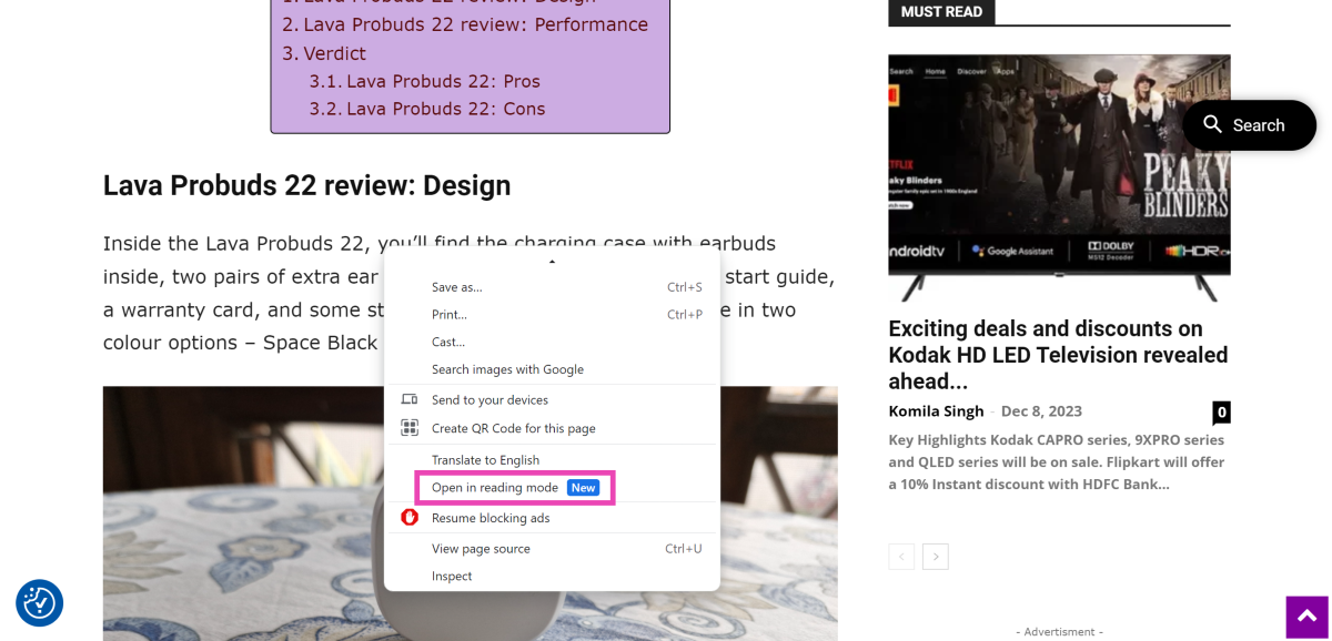 Τώρα που έχετε βγάλει αυτά τα εμπόδια, απλά κάντε κλικ στοΕικονίδιο πλευρικού πλαισίουΣτο επάνω δεξιό τμήμα του παραθύρου Chrome για πρόσβαση στη λειτουργία ανάγνωσης. Συνήθως, θα πρέπει να ανοίξει ως προεπιλεγμένη επιλογή. Εάν δεν συμβαίνει, απλά κάντε κλικ στο αναπτυσσόμενο μενού και επιλέξτε τη λειτουργία ανάγνωσης. Ένας άλλος τρόπος που μπορείτε να έχετε πρόσβαση σε αυτήν τη λειτουργία είναι κάνοντας δεξί κλικ οπουδήποτε στο άρθρο και επιλέγονταςΑνοίξτε στη λειτουργία ανάγνωσης. Αυτό είναι!
