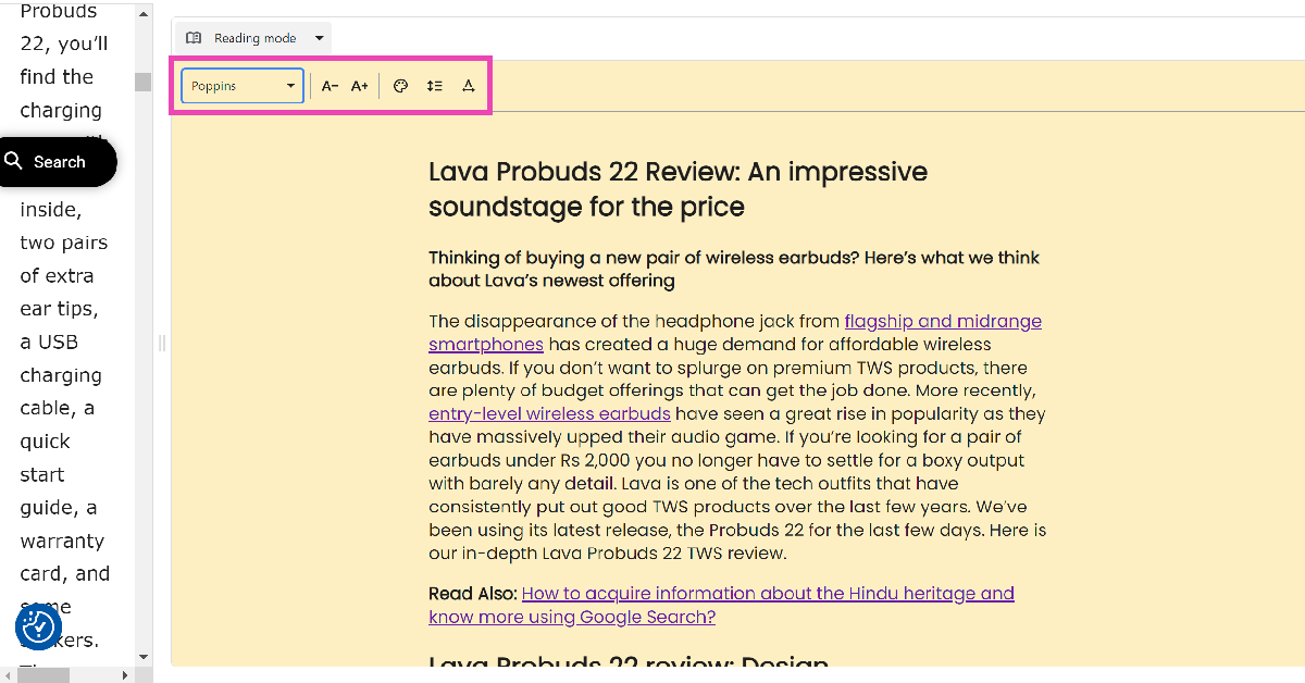 Ακριβώς δίπλα σε αυτό το αναπτυσσόμενο μενού, θα βρείτε την επιλογή να αλλάξετε το μέγεθος του κειμένου. Το εικονίδιο έγχρωμης πλάκας σας επιτρέπει να επιλέξετε το χρώμα φόντου για τον πίνακα ανάγνωσης. Υπάρχουν πέντε επιλογές που προσφέρονται -Αθέτηση,Φως,Σκοτάδι,Κίτρινος,Μπλε. Τέλος, μπορείτε να χρησιμοποιήσετε τα δύο τελευταία εικονίδια για να επιλέξετε το επίπεδο απόστασης μεταξύ των γραμμών και των μεμονωμένων γραμμάτων.