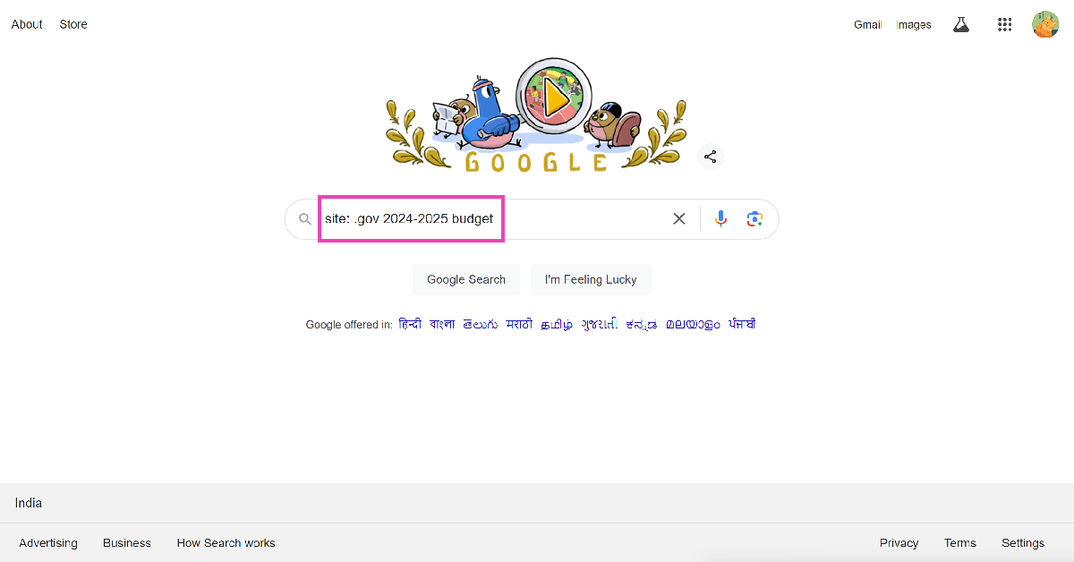 Βήμα 2:Πληκτρολογήστε το δικό σαςΑναζήτηση αναζήτησης. Για παράδειγμα: Εάν ψάχνετε για τις λεπτομέρειες που σχετίζονται με τον προϋπολογισμό 2024-25, πληκτρολογήστεΙστοσελίδα: .gov Προϋπολογισμός 2024-25.
