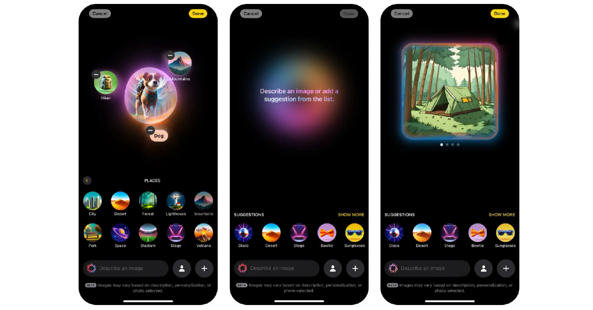 Το Playground Image είναι η γεννήτρια εικόνων AI της Apple που προσφέρεται ως μέρος του πακέτου Apple Intelligence. Ψάχνεται σε εγγενείς εφαρμογές όπως μηνύματα, σημειώσεις και freeform. Δεν είναι διαθέσιμο ακόμα στην Apple Music. Η Playground Image υπάρχει επίσης ως αυτόνομη εφαρμογή στο iPhone, όπως και ο άμεσος αντίπαλός του Android - Pixel Studio.