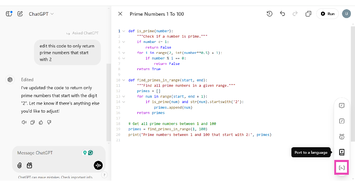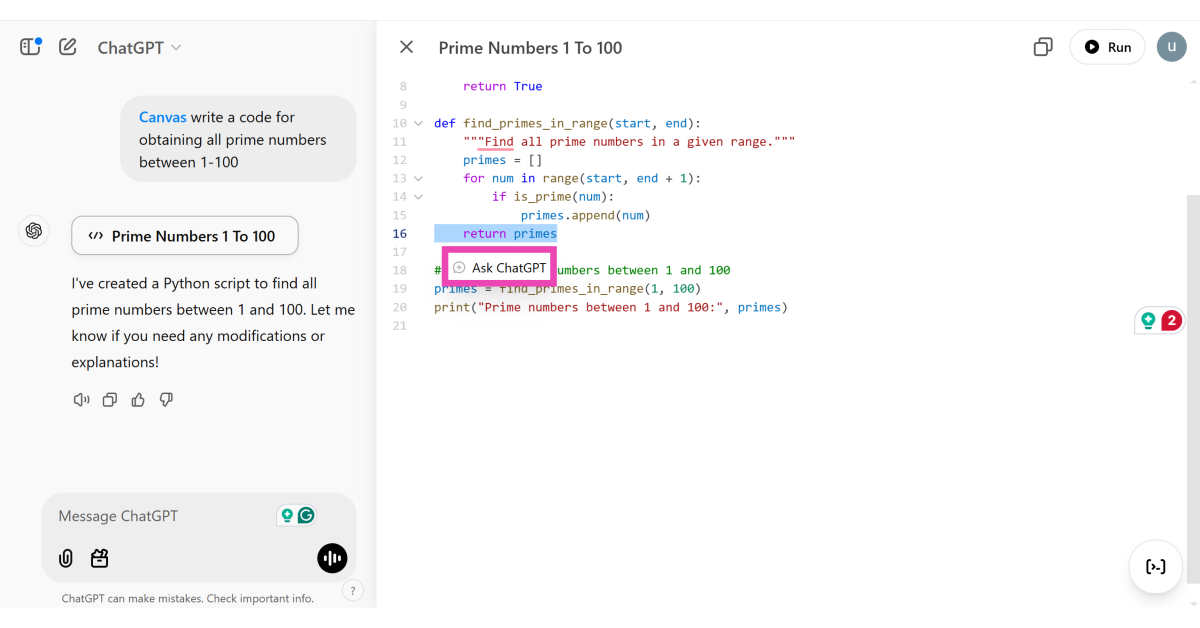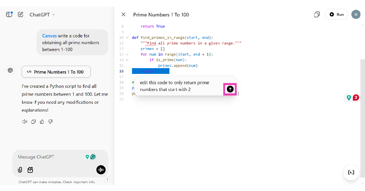 Μπορείτε να χρησιμοποιήσετε καμβά στο ChatGPT για έργα γραφής και κωδικοποίησης. Μόλις το chatbot έρχεται με ένα κομμάτι κειμένου ή κώδικα με βάση την προτροπή σας, μπορείτε να χρησιμοποιήσετε καμβά για να κάνετε αλλαγές σε συγκεκριμένα τμήματα του έργου.
