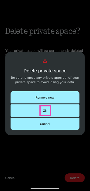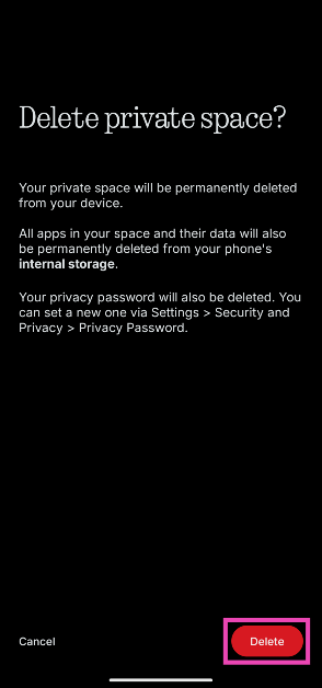 Ναι, μόλις διαγράψετε τον ιδιωτικό χώρο, θα χάσετε όλα τα προστατευμένα αρχεία, τις φωτογραφίες και τις εφαρμογές σας.