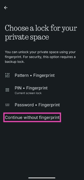 Βήμα 5:Και οι τρεις κλειδαριές που αναφέρονται μπορούν να συνδυαστούν με το δικό σαςδακτυλικό αποτύπωμα. Εάν δεν θέλετε να παράσχετε τα βιομετρικά σας δεδομένα, πατήστεΣυνεχίστε χωρίς δακτυλικό αποτύπωμα.
