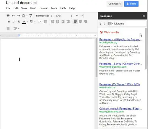 Ξεκινήστε να μαθαίνετε πώς να χρησιμοποιείτε το εργαλείο έρευνας Google Docs απλά πληκτρολογώντας έναν όρο αναζήτησης στο πεδίο αναζήτησης. Το ερευνητικό εργαλείο θα εμφανίσει στη συνέχεια τα αποτελέσματα που θα περιμένατε αν χρησιμοποιούσατε την αναζήτηση Google στην καρτέλα του προγράμματος περιήγησης.