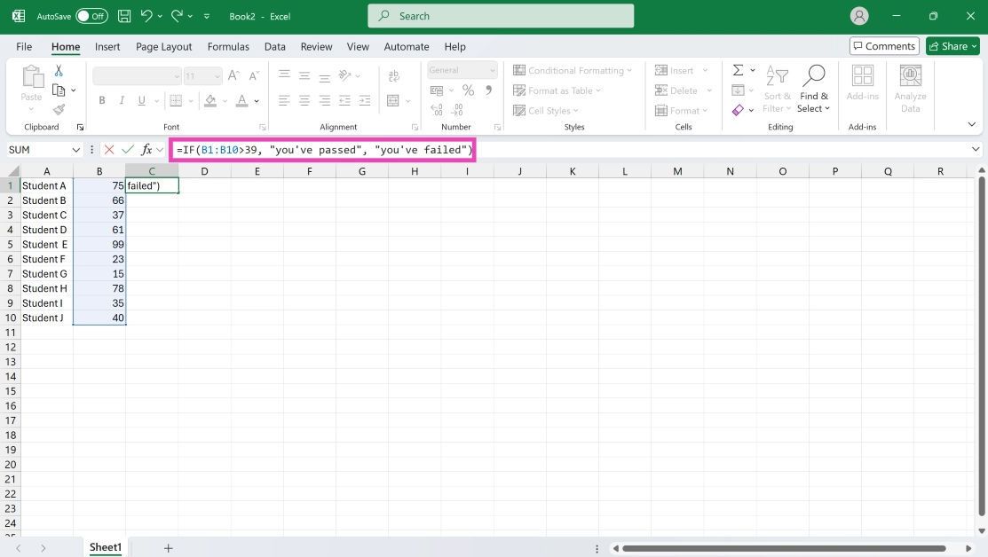 = If (b1: b10> 39, "Έχετε περάσει τη δοκιμή", "έχετε αποτύχει τη δοκιμή")