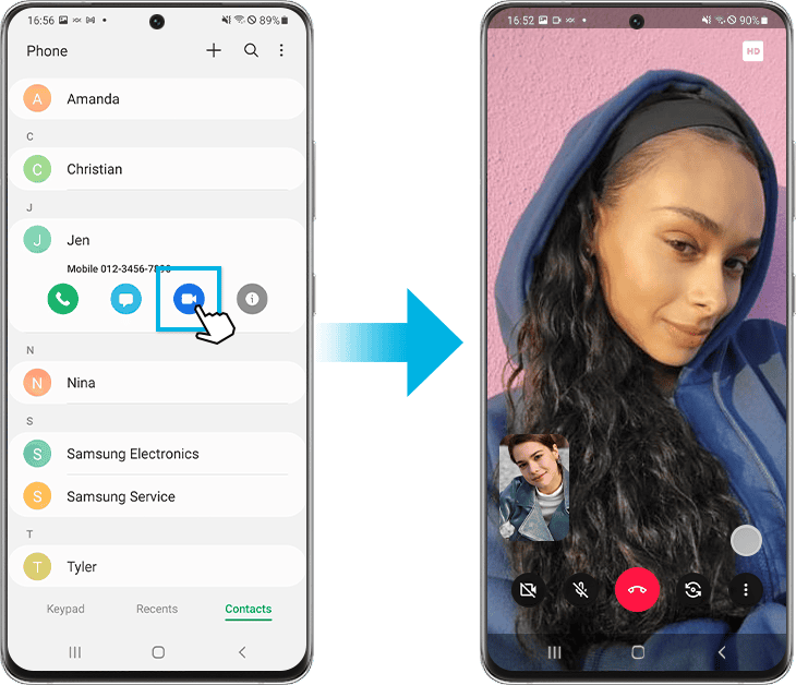 Οι χρήστες της Samsung μπορούν εύκολα να πραγματοποιήσουν βίντεο κλήσειςκάρτες επικοινωνίαςπατώντας το κουμπί βίντεο. Άλλα τηλέφωνα Android προσφέρουν παρόμοιες απλές μεθόδους για την έναρξη συνομιλιών μέσω βίντεο.