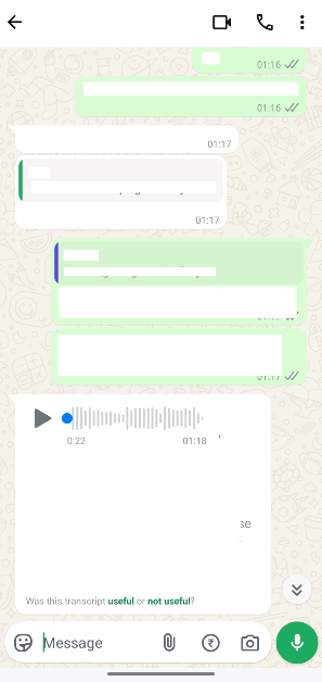 Δεδομένου ότι το WhatsApp κατεβάζει πακέτα γλώσσας για μεταγραφή στη συσκευή, μπορείτε να μεταγράψετε φωνητικές σημειώσεις στον αγγελιοφόρο χωρίς πρόσβαση στο Διαδίκτυο.