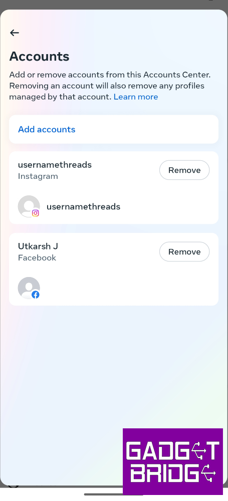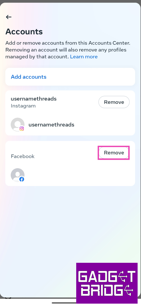 Βήμα 7:Τέλος, επιλέξτεΠροσθέστε λογαριασμούςκαιεκ νέου προσθήκηΟ λογαριασμός σας στο Facebook.