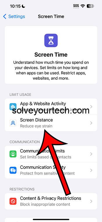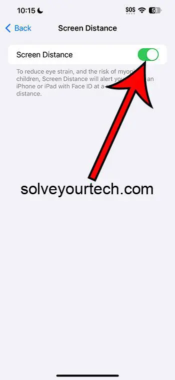 Μπορείτε να ενεργοποιήσετε ή να απενεργοποιήσετε τη ρύθμιση απόστασης οθόνης στο iPhone σας πηγαίνονταςΡυθμίσεις> Χρόνος οθόνης> Απόσταση οθόνης>και πατώντας τοΑπόσταση οθόνηςκουμπί.