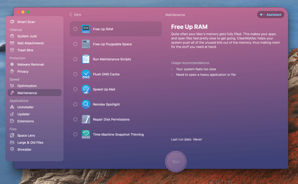 Cleanmymac xΣας επιτρέπει να απελευθερώσετε τη μνήμη RAM, να εκτελέσετε σενάρια συντήρησης, να ξεπλύνετε την προσωρινή μνήμη DNS, να επιταχύνετε το ταχυδρομείο, να επισκευάσετε τα δικαιώματα δίσκου και να εκτελέσετε αραίωση στιγμιότυπου χρόνου, όλα με το πάτημα ενός κουμπιού.