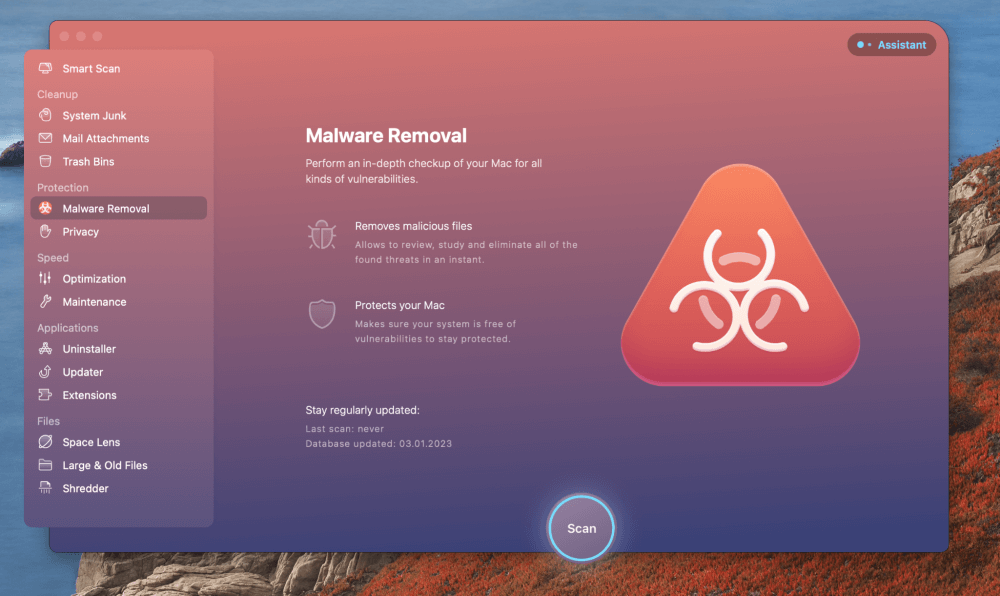 Ακόμη πιο σημαντικό, μπορείτε να ελέγξετε για επιβλαβή κακόβουλο λογισμικό για να διατηρήσετε το σύστημά σας ασφαλές. Το CleanMYMAC X είναι ένα αξιόπιστο λογισμικό προστασίας από ιούς, με ενσωματωμένη χρησιμότητα για την αφαίρεση κακόβουλων αρχείων. Η εφαρμογή σας επιτρέπει να ελέγξετε, να μελετήσετε και να εξαλείψετε τις απειλές μέσα σε λίγα λεπτά.