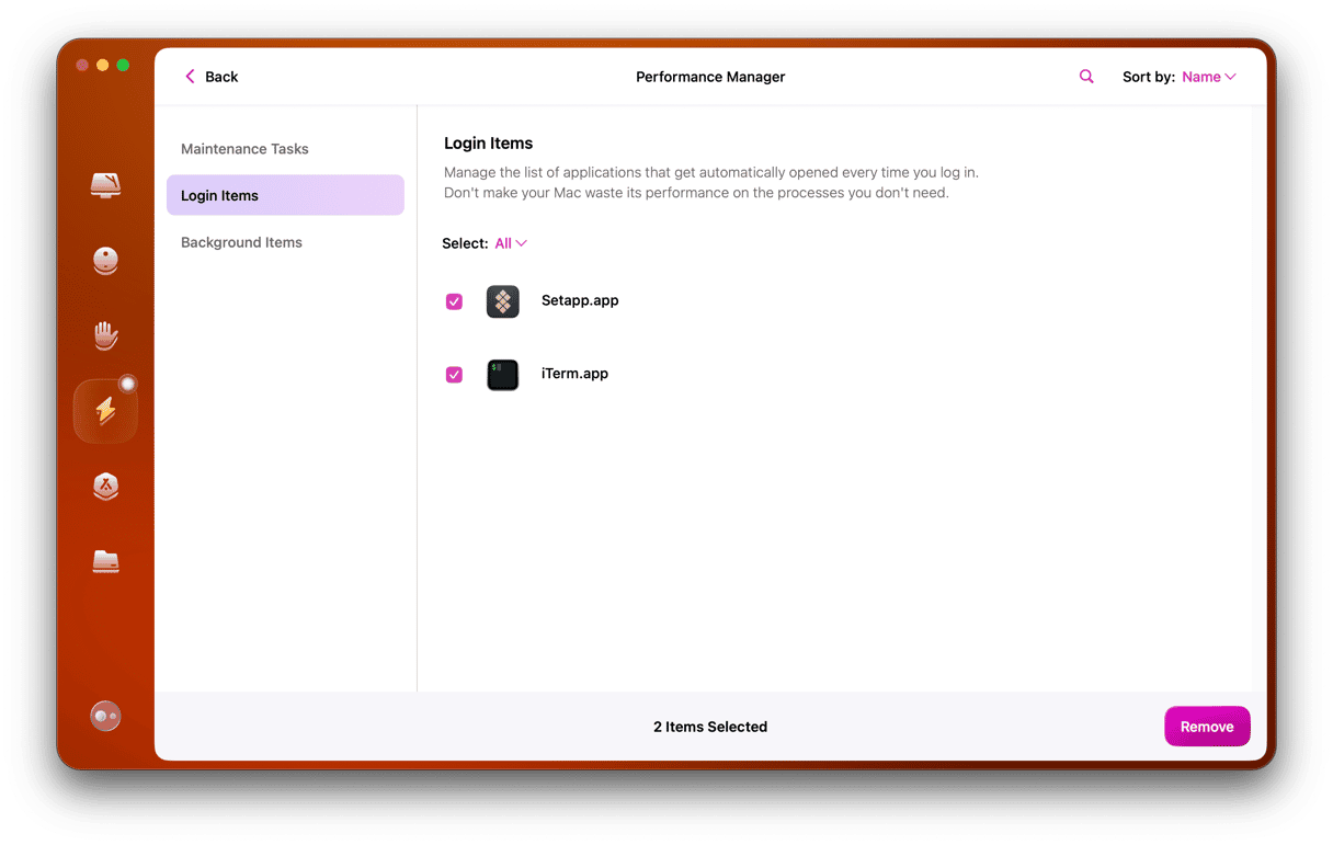 Παρεμπιπτόντως, αν είστε άβολα μπερδεύετε με τις ρυθμίσεις του συστήματος, υπάρχει μια εύκολη εναλλακτική λύση. Το CleanMYMAC, η εφαρμογή που αναφέραμε παραπάνω, διαθέτει πολλά εργαλεία για συντήρηση MAC βαθύ επίπεδο. Έχει επίσης ένα χαρακτηριστικό για την απενεργοποίηση/ενεργοποίηση στοιχείων σύνδεσης που ενδέχεται να επηρεάσουν την απόδοση MAC.