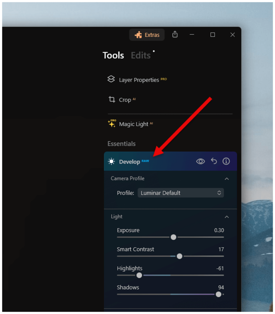 Το Luminar έχει πολύ περισσότερα εργαλεία αυτόματης ρύθμισης με απλά ρυθμιστικά, αλλά όταν πρόκειται για τα βασικά εργαλεία ανάπτυξης, είναι αρκετά παρόμοια. Σύμφωνα με το κοινό -στόχο του, ο Luminar κρύβει το ιστόγραμμα από τη διεπαφή από προεπιλογή, αλλά είναι αρκετά εύκολο να το ενεργοποιήσετε εάν το χρειάζεστε.