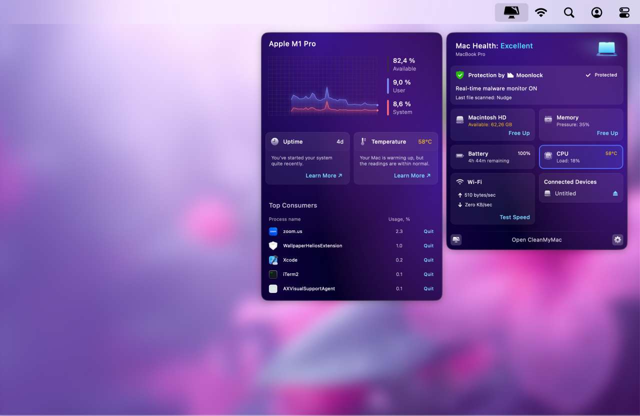 Διατηρώ πάντα την εφαρμογή Μενού του CleanMyMac στη γραμμή μενού για ταχύτερη διαλογή. Δείχνει ζωντανά τους κορυφαίους καταναλωτές CPU και μου επιτρέπει να κλείσω μια εφαρμογή με ένα κλικ. Εάν δεν την έχετε ήδη εγκαταστήσει, μπορείτε να δοκιμάσετε την εφαρμογή για 7 ημέρες (αποκτήστε τη δωρεάν δοκιμή σας εδώ).