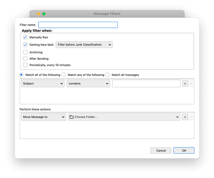 Το Thunderbird προσφέρει τόσο φακέλους όσο και ετικέτες, καθώς και ισχυρό φιλτράρισμα μηνυμάτων για να ταξινομήσετε αυτόματα το email σας. Σας επιτρέπουν να ταιριάζουν με τα μηνύματα ηλεκτρονικού ταχυδρομείου σας χρησιμοποιώντας ένα συνδυασμό κριτηρίων και, στη συνέχεια, εκτελείτε μία ή περισσότερες ενέργειες στα μηνύματα που ταιριάζουν. Αυτό περιλαμβάνει τη μετακίνηση ή την αντιγραφή του μηνύματος σε ένα φάκελο ή μια ετικέτα, προωθώντας το σε άλλο άτομο, με πρωταγωνιστή ή καθορίζοντας μια προτεραιότητα, σηματοδοτώντας το διαβάζοντας ή μη αναγνωσμένο και πολλά άλλα.