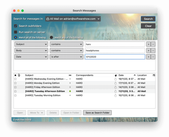 Σε αυτό το παράδειγμα, δημιούργησα μια αναζήτηση όπου τα μηνύματα που ταιριάζουν έπρεπε να πληρούν τρία κριτήρια: