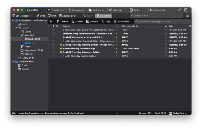 Η σκοτεινή λειτουργία του ThunderbirdΤο Mailbird προσφέρει ένα τεράστιο όφελος για τους χρήστες του Gmail: χρησιμοποιεί τις ίδιες συντομεύσεις πληκτρολογίου. Το Thunderbird δεν το κάνει αυτό από προεπιλογή, αλλά έχει ένα δικό του πλεονέκτημα: μπορεί να επεκταθεί απόπρόσθετα. ΟΝοσταλγίακαιGmailuiΟι επεκτάσεις σας επιτρέπουν να χρησιμοποιείτε συντομεύσεις πληκτρολογίου Gmail και πολλά άλλα όταν χρησιμοποιείτε το Thunderbird.