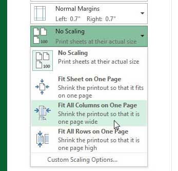 Κάντε κλικ στην επιλογή εκτύπωσηςΒήμα 4: Κάντε κλικ στοΧωρίς κλιμάκωσηεπιλογή στο κάτω μέρος του παραθύρου και, στη συνέχεια, κάντε κλικ στοΤοποθετήστε όλες τις στήλες σε μία σελίδαεπιλογή.