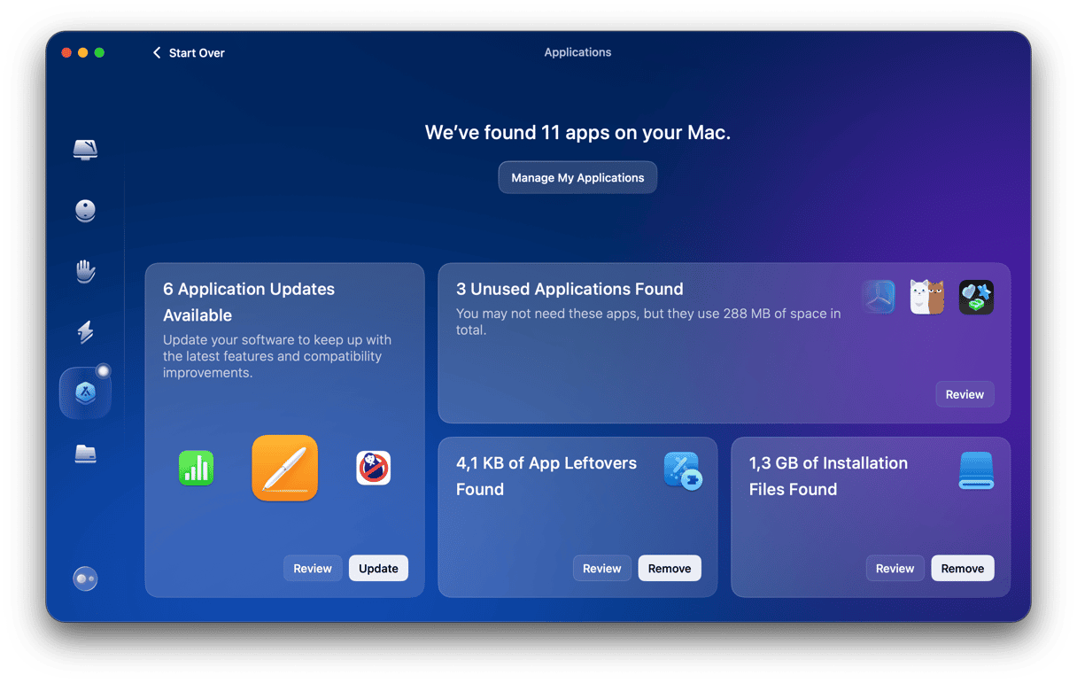 - Ανοίξτε το CleanMYMAC και επιλέξτε εφαρμογές στην αριστερή πλαϊνή μπάρα.