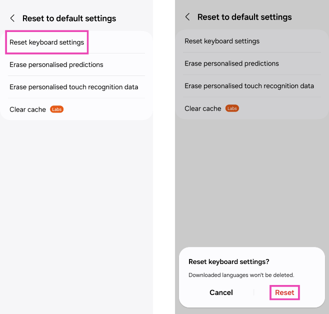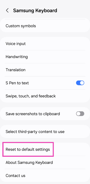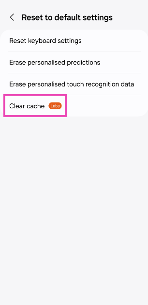 Πατήστε ένα πεδίο κειμένου για να ενεργοποιήσετε το πληκτρολόγιο Samsung, πατήστε το εικονίδιο Ρυθμίσεις και μεταβείτε στοΕπαναφορά σε προεπιλεγμένες ρυθμίσεις> Καθαρίστε την προσωρινή μνήμη.