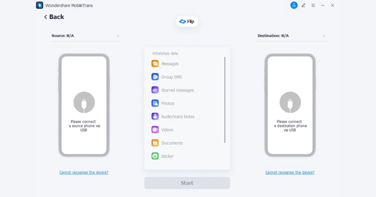Συνδέστε τα τηλέφωνα πηγής και προορισμού στον υπολογιστή σας και αφήστε το λογισμικό να φορτώσει όλα τα μηνύματα και τα μέσα. Μόλις φορτωθούν όλα, κάντε κλικ στο κουμπί "Έναρξη" για να ξεκινήσετε τη διαδικασία μεταφοράς δεδομένων WhatsApp. Αυτό το εργαλείο σας προσφέρει ακόμη και τη λειτουργία για να αναστρέψετε μεταξύ των συσκευών προέλευσης και προορισμού.