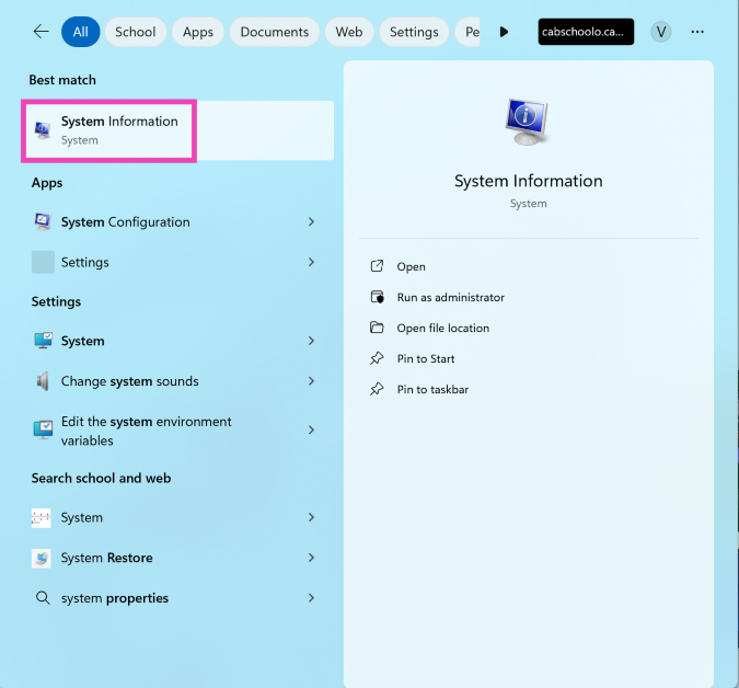 Χρησιμοποιήστε τη γραμμή αναζήτησης στη γραμμή εργασιών για να βρείτε «πληροφορίες συστήματος» και μεταβείτε στην καρτέλα Περίληψη συστήματος για να μάθετε τι ονομάζεται ο φορητός υπολογιστής σας.
