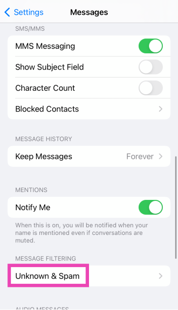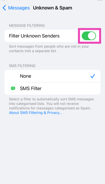 ΠηγαίνωΡυθμίσεις> μηνύματα> Άγνωστο και ανεπιθύμητοΚαι απενεργοποιήστε το διακόπτη εναλλαγής για άγνωστους αποστολείς φίλτρου.