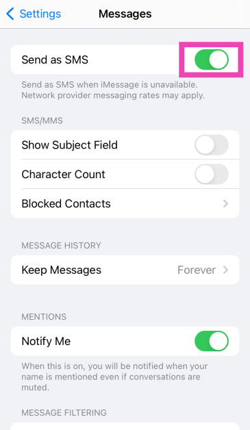Για να βεβαιωθείτε ότι η εφαρμογή iMessage δεν μπερδεύεται με τακτικές υπηρεσίες SMS, απενεργοποιήστε και δοκιμάστε να στείλετε ξανά το κείμενο. Εδώ είναι.