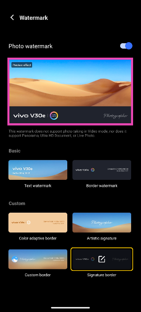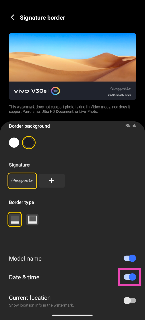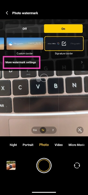 Οι περισσότερες εφαρμογές εγγενών κάμερας σε smartphones Android επιτρέπουν στους χρήστες να προσθέσουν υδατογράφημα στις εικόνες τους. Αυτό το υδατογράφημα μπορεί να τροποποιηθεί για να ενσωματώσει την ημερομηνία και την ώρα επίσης. Μερικοί ΚΑΕ όπως το Vivo Αφήστε τον χρήστη να αλλάξει το σχεδιασμό υδατογράφων, την εικόνα φόντου, τη γραμματοσειρά και το μέγεθος.