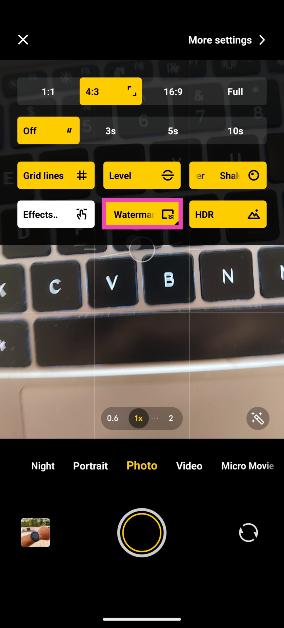 Ξεκινήστε την εφαρμογή κάμερας, μεταβείτε στοΡυθμίσεις> Watermark> Προεπισκόπηση υδατογράφημα, και ενεργοποιήστε το διακόπτη εναλλαγής για ημερομηνία και ώρα.
