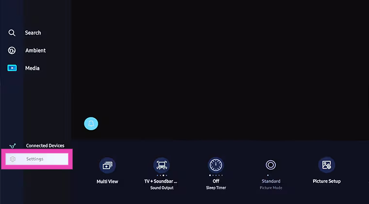 Βήμα 1:Πατήστε τοΚουμπί γρήγορων ρυθμίσεωνστο τηλεχειριστήριο και επιλέξτεΡυθμίσεις. Εάν το τηλεχειριστήριο δεν διαθέτει αφιερωμένο κουμπί ρυθμίσεις, επιλέξτεΡυθμίσειςαπό την τηλεόρασή σαςαρχική σελίδα.