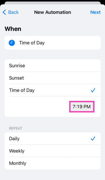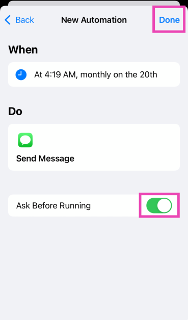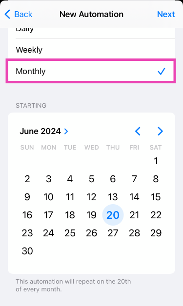 Βήμα 5:ΜελετώΜηνιαίοςκαι επιλέξτε τοημερομηνίαστην οποία θέλετε να στείλετε το μήνυμα. Πρέπει να γνωρίζετε ότι η εφαρμογή συντομεύσεων θα αυτοματοποιήσει αυτήν την ενέργεια μηνιαίως, οπότε θυμηθείτεδιαγράφωΑυτή η αυτοματοποίηση μόλις εκπληρωθεί ο σκοπός του.
