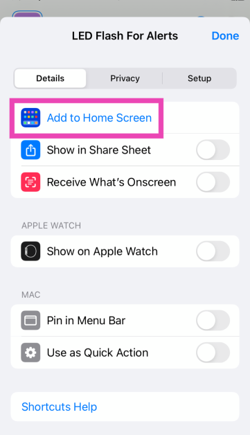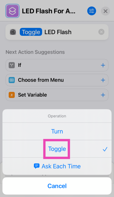 Μπορείτε να χρησιμοποιήσετε την εφαρμογή συντομεύσεων για να δημιουργήσετε ένα κουμπί εναλλαγής για ειδοποιήσεις Flash LED στην αρχική οθόνη του iPhone σας. Προσθέστε τη δράση στο "Flash LED" και αλλάξτε τη ρύθμιση "στροφής" σε "εναλλαγή". Τώρα, πατήστε το εικονίδιο του μενού και προσθέστε το στην αρχική οθόνη.