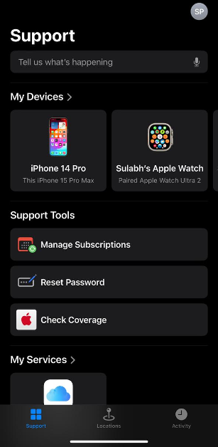 Βήμα 3:Η αρχική σελίδα της εφαρμογής θα εμφανίσει τη συσκευή που χρησιμοποιείτε αυτή τη στιγμή. Εάν θέλετε να ζητήσετε βοήθεια για μια άλλη συσκευή που έχει εγγραφεί στο λογαριασμό σας Apple, πατήστεΠροϊόνταΣτην επάνω αριστερή γωνία της οθόνης.