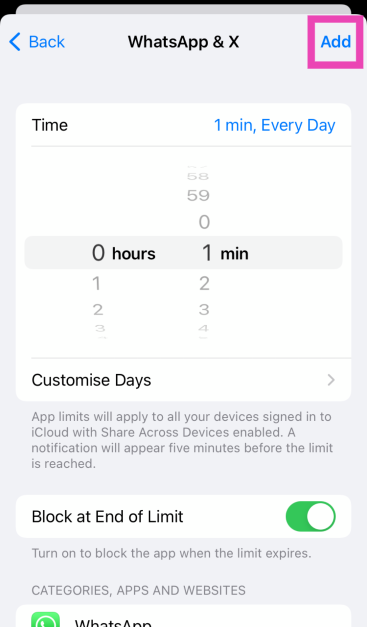 Βήμα 7:Ρυθμίστε το χρονοδιακόπτη σε1 λεπτόκαι πατήστεΠροσθέτωΣτην επάνω δεξιά γωνία της οθόνης.