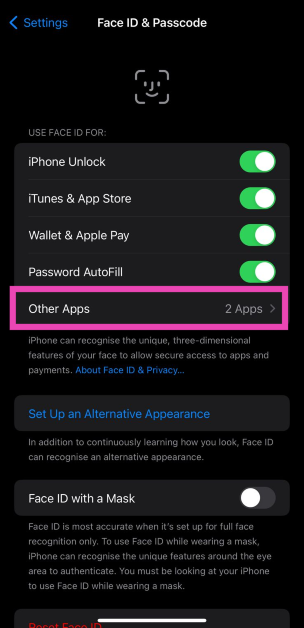 Βήμα 2:Στο"Χρησιμοποιήστε το αναγνωριστικό προσώπου για"Ενότητα, επιλέξτεΆλλες εφαρμογές.