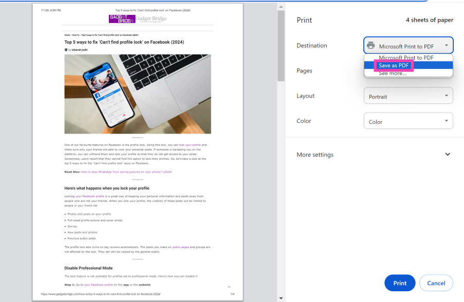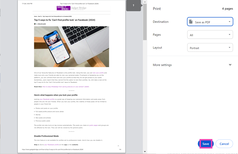 Ανοίξτε την ιστοσελίδα στο Google Chrome, κάντε κλικ στις ελλείψεις, επιλέξτε 'Εκτύπωση', πατήστε στο αναπτυσσόμενο μενού, επιλέξτε 'Αποθήκευση ως PDF' και πατήστε 'Αποθήκευση'.