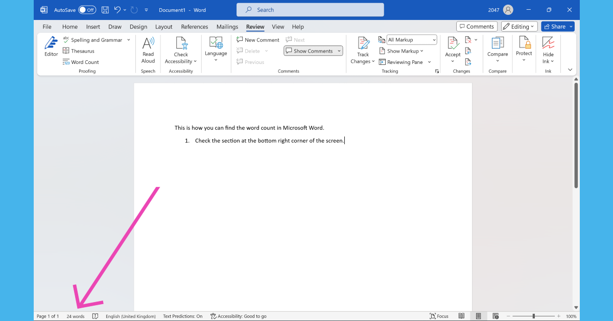 Επισημάνετε το πέρασμα και πατήστεCtrl + Shift + Gγια να βρείτε τον αριθμό των λέξεων σε αυτό. Ο αριθμός των λέξεων εμφανίζεται επίσης στο κάτω δεξί τμήμα της οθόνης. Μπορείτε επίσης να το δείτε από την καρτέλα Αναθεώρηση.