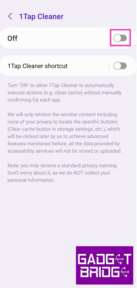 Βήμα 6:Δώστε πλήρες έλεγχο του τηλεφώνου σας 1TAP, ενεργοποιώντας το διακόπτη εναλλαγής τουΡυθμίσεις προσβασιμότητας. Αυτό θα είναι καθαριστικό 1TAP για να περάσει ξεχωριστά από κάθε εφαρμογή και να καθαρίσει την προσωρινή μνήμη της.