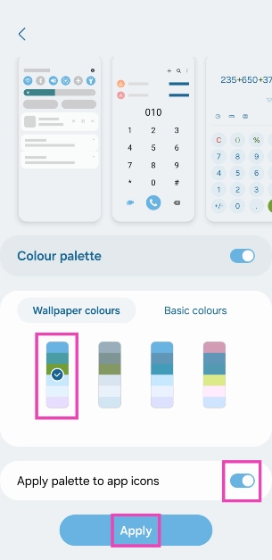 Βήμα 5:Ενεργοποιήστε το διακόπτη εναλλαγής για 'Εφαρμόστε εικονίδια παλέτας σε εφαρμογέςκαι χτύπημαΕφαρμόζω.
