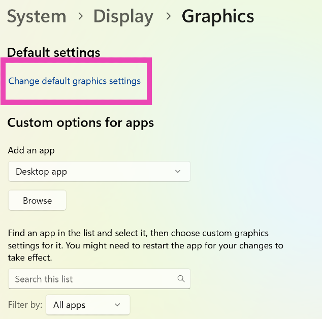 ΠηγαίνωΡυθμίσεις> Σύστημα> Εμφάνιση> Γραφικά, Κάντε κλικ στο "Αλλαγή των προεπιλεγμένων ρυθμίσεων γραφικών" και ενεργοποιήστε το διακόπτη εναλλαγής δίπλα στο "Προγραμματισμός GPU με επιτάχυνση υλικού".