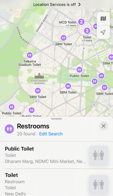 Η απλή απάντηση είναι όχι. Δεν χρειάζεται καν να ξεκινήσετε οποιαδήποτε εφαρμογή στο τηλέφωνό σας για να βρείτε μια κοντινή τουαλέτα. Μπορείτε να χρησιμοποιήσετε τη φωνή του βοηθού της συσκευής σας (Siri ή Google Assistant) για να τραβήξετε όλα τα αποτελέσματα και να τα απαριθμήσετε στο χάρτη. Οι Χάρτες Google διαθέτουν τον πιο εξαντλητικό κατάλογο δημόσιων εγκαταστάσεων, καλύπτοντας σχεδόν κάθε τοποθεσία κοντά σας. Εάν δεν μπορείτε να βρείτε μια τουαλέτα, ίσως θελήσετε να διευρύνετε την αναζήτησή σας και να αναζητήσετε ξενοδοχεία και δημόσια διαμονή. Κατόπιν αιτήματος, μπορεί να σας επιτρέψουν να χρησιμοποιήσετε τις εγκαταστάσεις τουαλέτας τους.