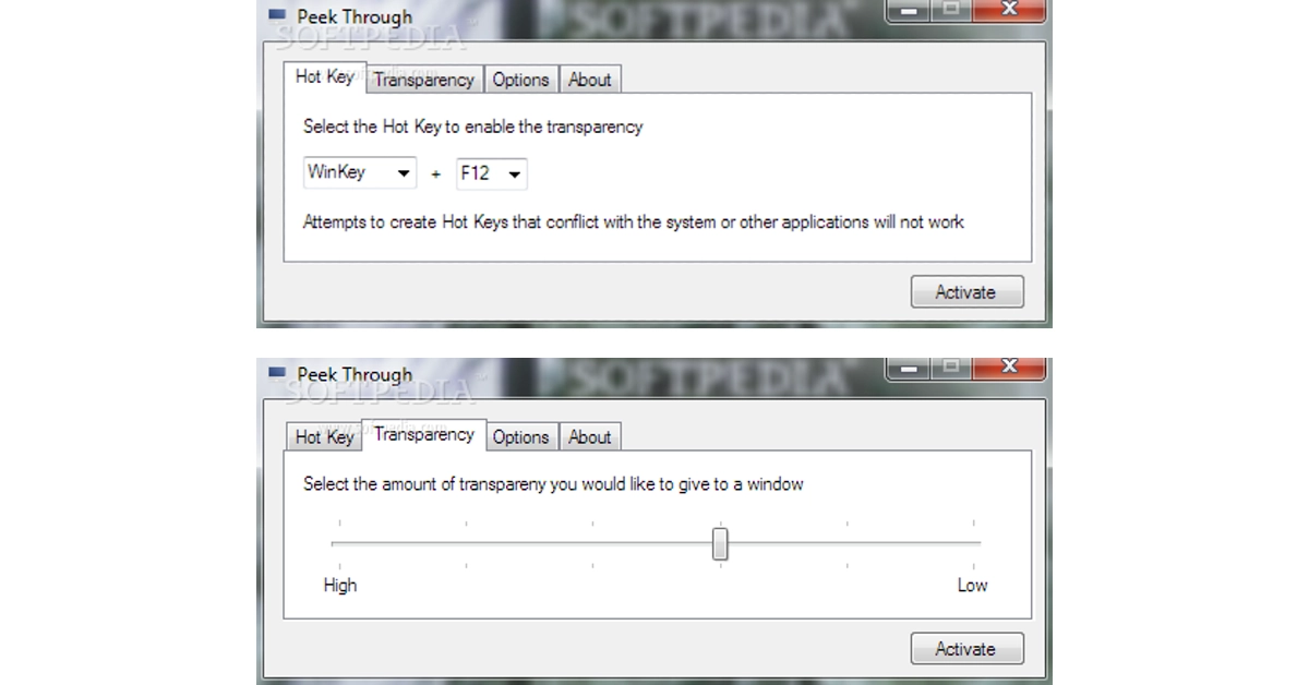 Το Peek ins είναι ένα άλλο εξαιρετικό εργαλείο για να κάνετε τα Windows διαφανή στα Windows 10/11 PC ή Laptop. Μπορείτε να κατεβάσετε αυτό το λογισμικό δωρεάν από το Softpedia. Μετά την εκτόξευση της Peek, το λογισμικό σας ζητά να ρυθμίσετε ένα πλήκτρο πρόσβασης για το φαινόμενο διαφάνειας. Μπορείτε να χρησιμοποιήσετε αυτό το hotkey ανά πάσα στιγμή για να εφαρμόσετε το φαινόμενο διαφάνειας σε ένα παράθυρο. Χρησιμοποιήστε την καρτέλα «Διαφάνεια» για να ρυθμίσετε ένα επίπεδο για το αποτέλεσμα. Μπορείτε επίσης να ορίσετε αυτό το λογισμικό για εκκίνηση.