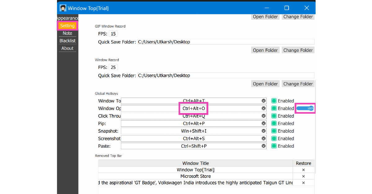 Η προεπιλεγμένη συντόμευση πληκτρολογίου για διαφανή παράθυρα στο WindowTop είναιCtrl + alt + o.